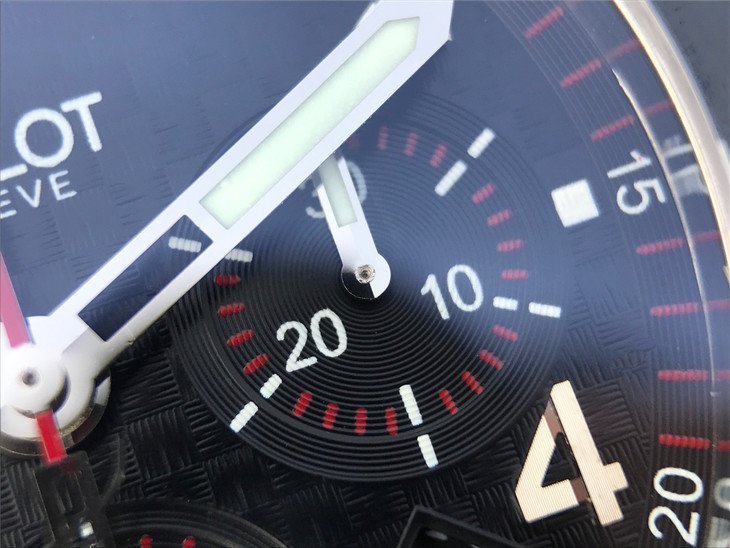Черный, с тиснением "Карбон". Сатинированные 3D арабские часовые индексы и мечевидные стрелки. Счетчики хронографа в отметках на 15 и 18.00 часов и малая секундная стрелка в отметке на 21.00 часов. Окно даты в отметке на 16:30 часов. |
