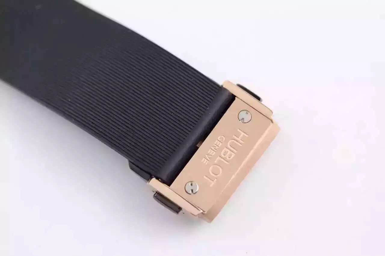 Черный каучуковый ремешок, с двойной раскладывающейся позолоченной, керамической застежкой Hublot. |