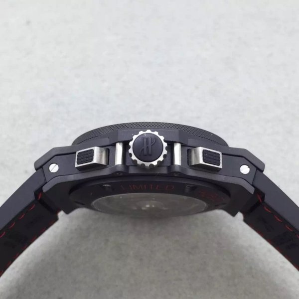 Чёрный, карбон. Стальные сатинированные часовые риски и мечевидные стрелки, покрытые люминесцентным составом. Счетчики хронографа в отметках на 15 и 18.00 часов и малая секундная стрелка в отметке на 21.00 часов. Окно даты в отметке на 16.30 часов. |