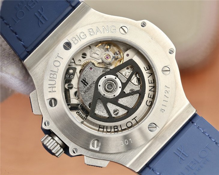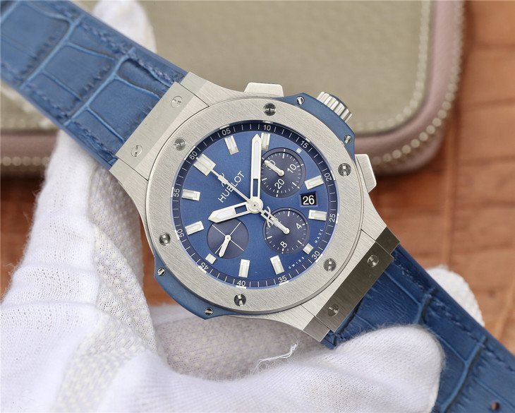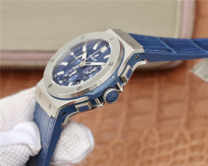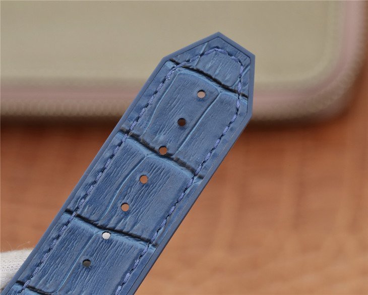 Синий кожаный (кожа/каучук) ремешок, с двойной раскладывающейся стальной застежкой Hublot, состоящей из нескольких частей. |