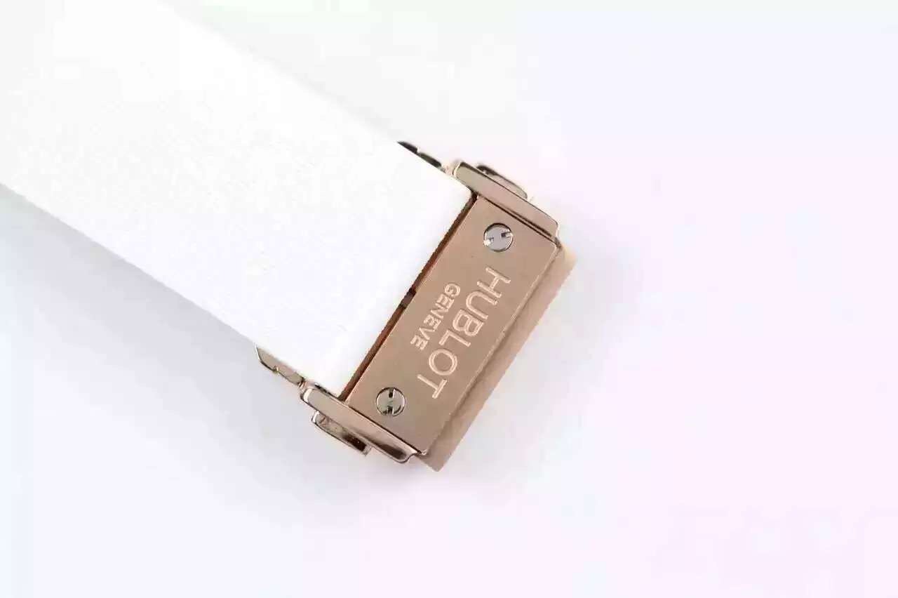 Белый каучуковый ремешок, с двойной раскладывающейся позолоченной застежкой Hublot. Либо белый кожаный (кожа/каучук) ремешок. |