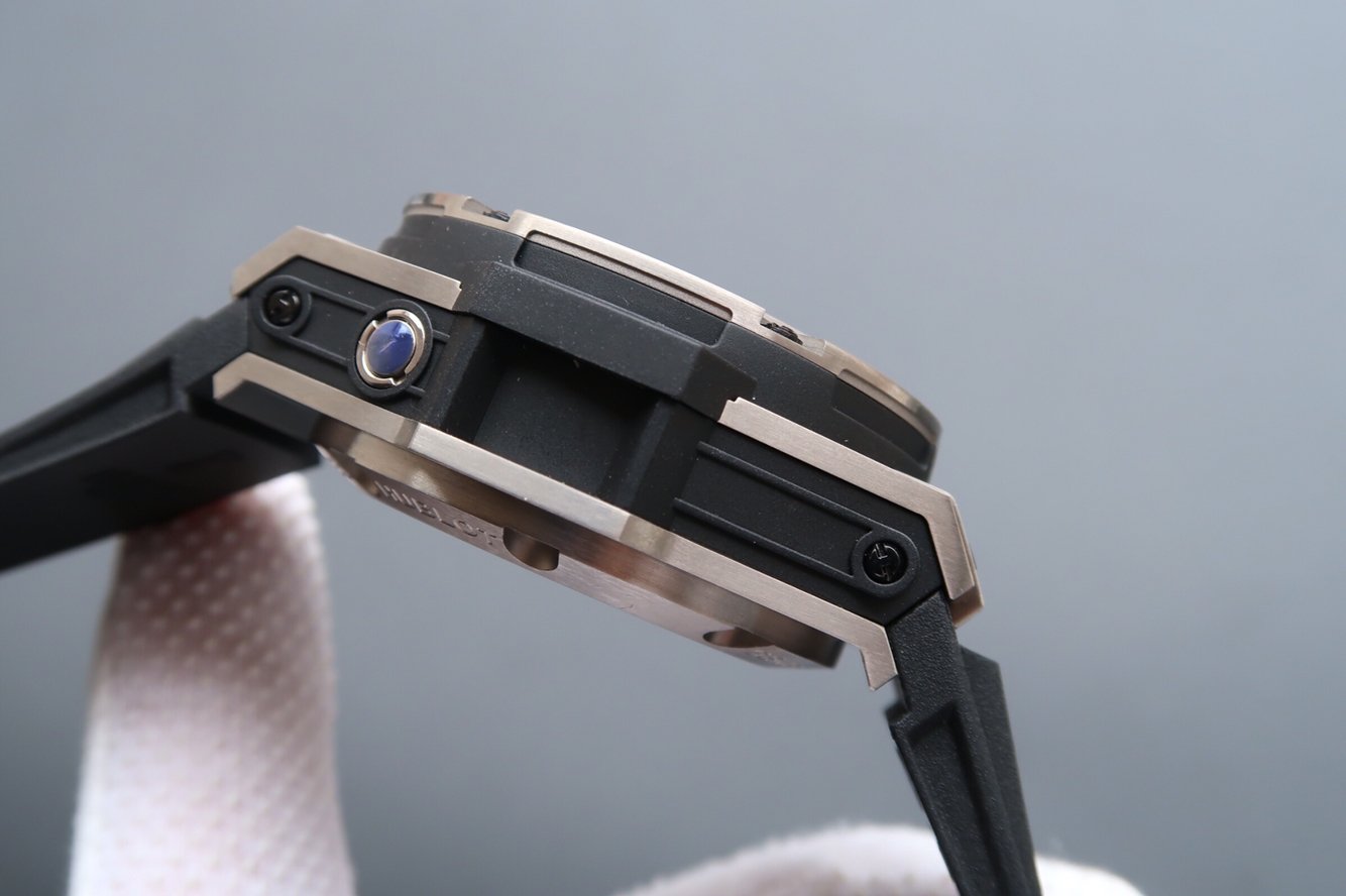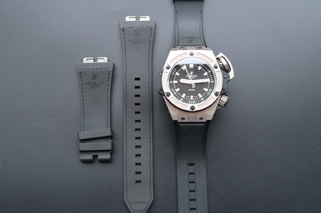 Черный каучуковый ремешок, с простым (с помощью шипа) титановым сендвич замков Hublot, состоящим из нескольких частей и скрепленным двумя винтами и кнопками быстрой смены ремешка. |