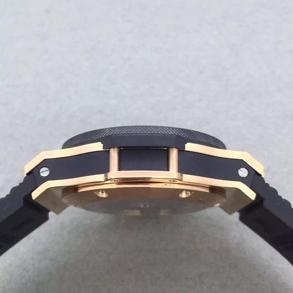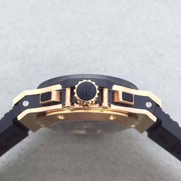 Чёрный каучуковый ремешок, с двойной раскладывающейся позолоченной застежкой Hublot, состоящей из нескольких частей.