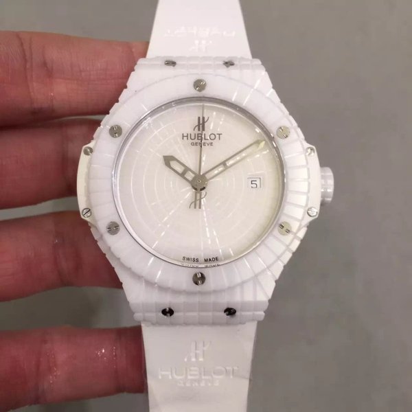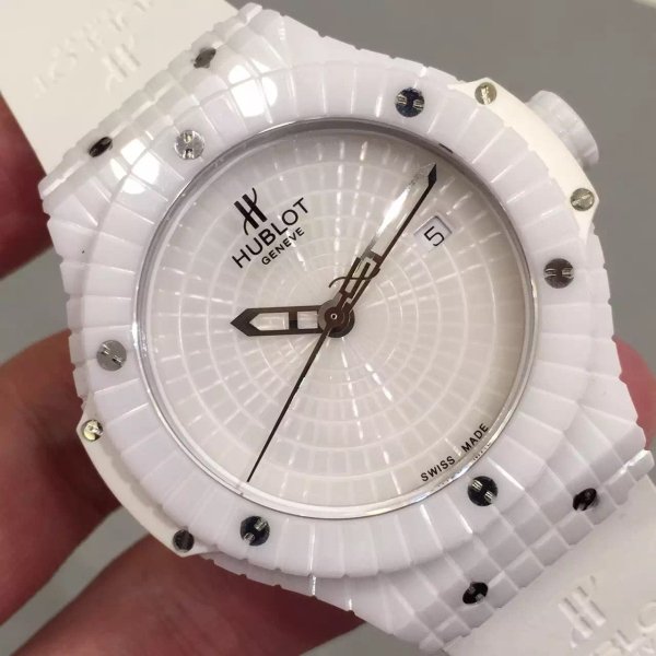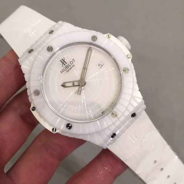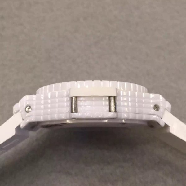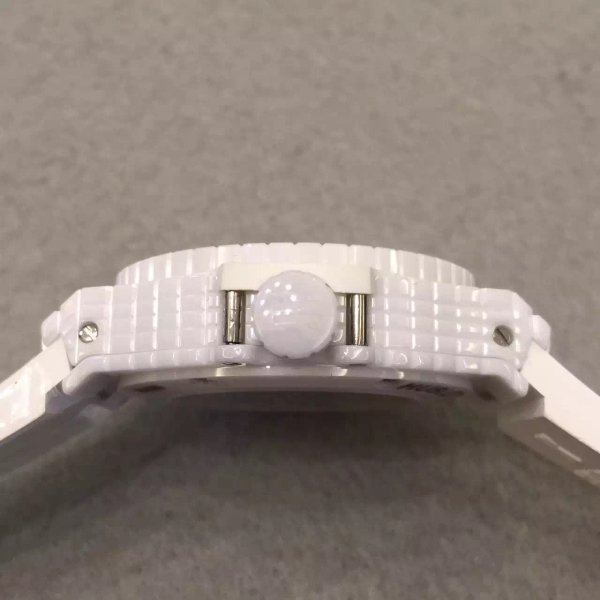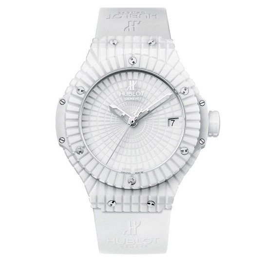 Белый, керамический. Стальные сатинированные стрелки. Окно даты, расположенное в отметке на 15.00 часов |