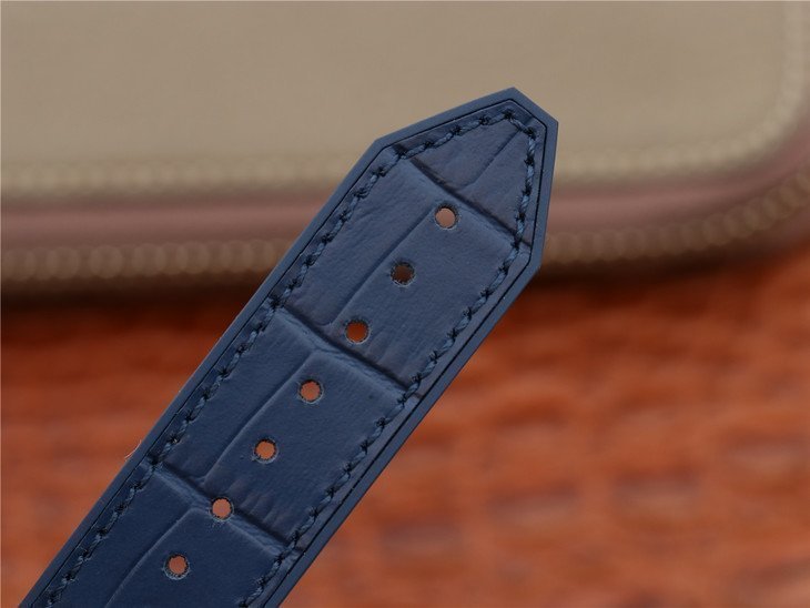 Синий кожаный (кожа/каучук) ремешок, с двойной раскладывающейся позолоченной застежкой Hublot с позолоченной вставкой.