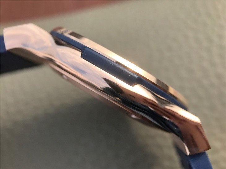 Фиксированный в одном положении 6 Н-образными полированными винтами стальной безель грубой шлифовки, покрытый розовым золотом методом PVD.