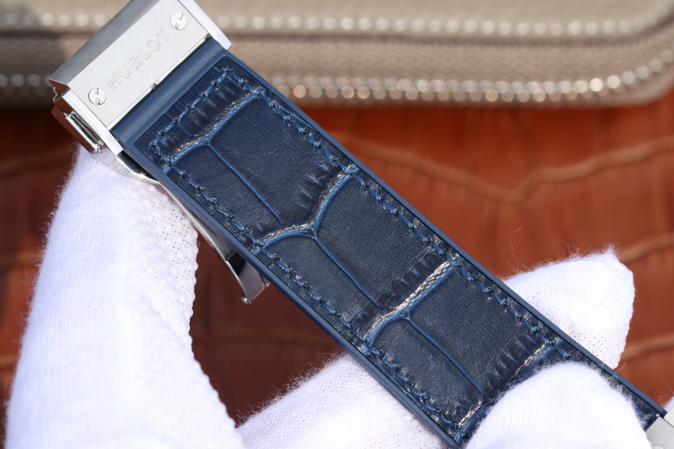 Синий кожаный (кожа/каучук) ремешок, с двойной раскладывающейся стальной застежкой Hublot. |