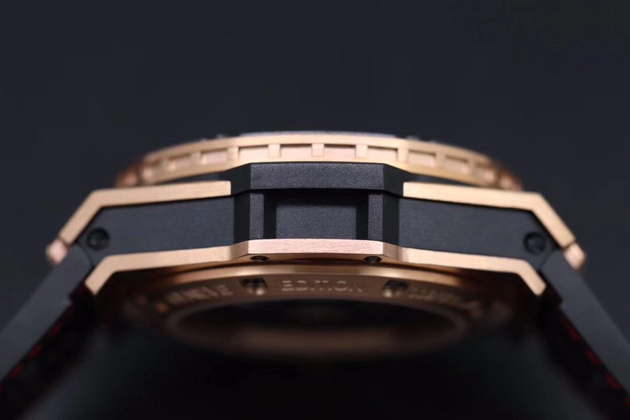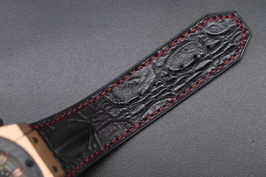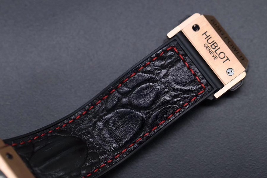 Чёрный кожа/каучук ремешок, с двойной, раскладывающейся позолоченной застежкой Hublot. |