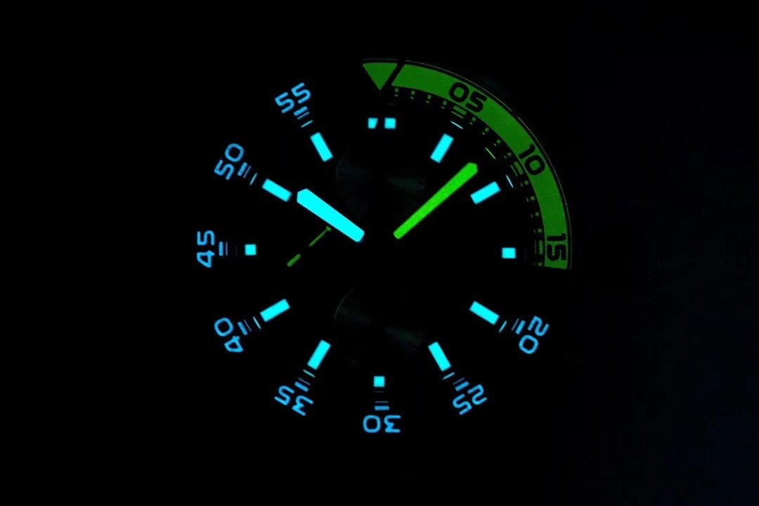 Синий. Часовые риски и мечевидные стрелки, покрытые люминесцентным составом Super LumiNova С1. Окно даты, расположенное в отметке на 15.00 часов. Индикаторы хронографа |