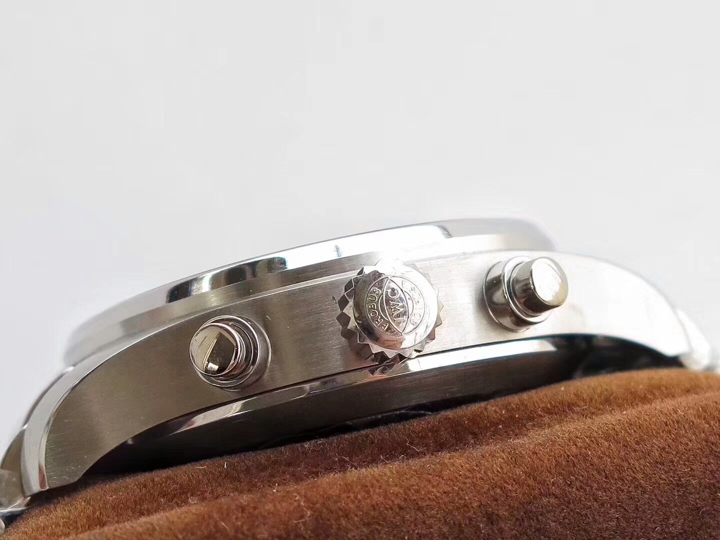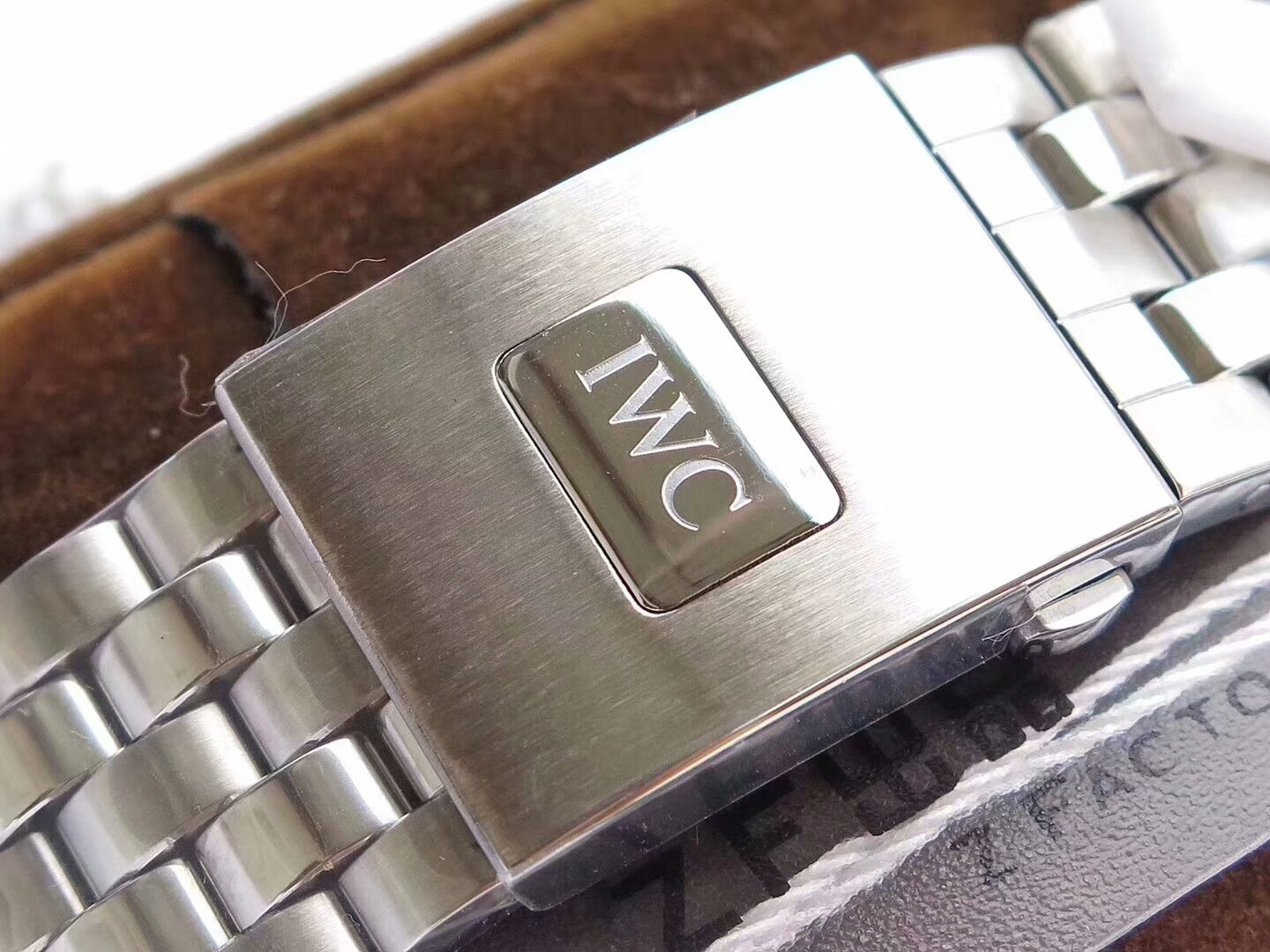 Стальной браслет нового образца из сатинированной стали 316L, с двойной раскладывающейся застежкой IWC и удлиняющим звеном. Либо коричневый кожаный ремешок из телячьей кожи, прошитый белыми нитками, с простым (с помощью шипа) замком IWC. |