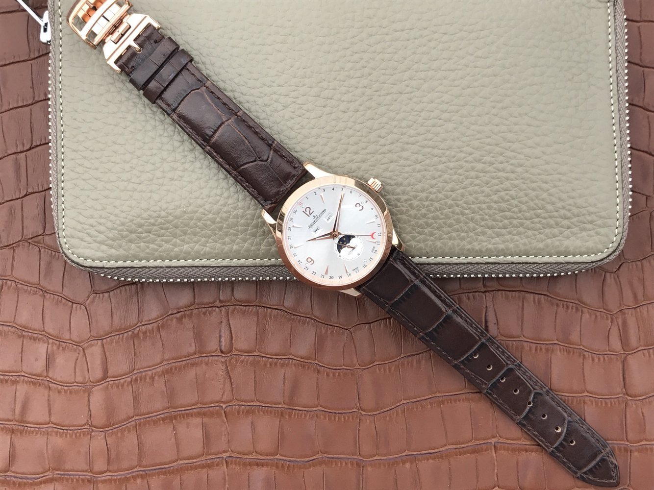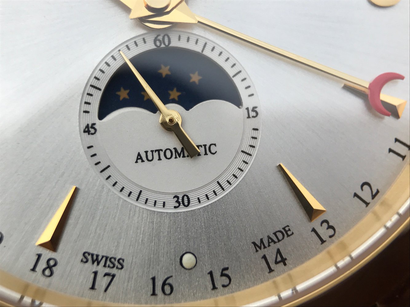 Серебристый, гильошированный. Позолоченные часовые риски и индексы. Разграниченный календарь по радиусу циферблата. Индикатор день/ночь в отметке на 18:00 часов. Годовой календарь с указателями дня недели и месяца в отметке на 12:00 часов. |