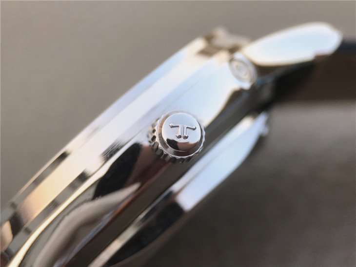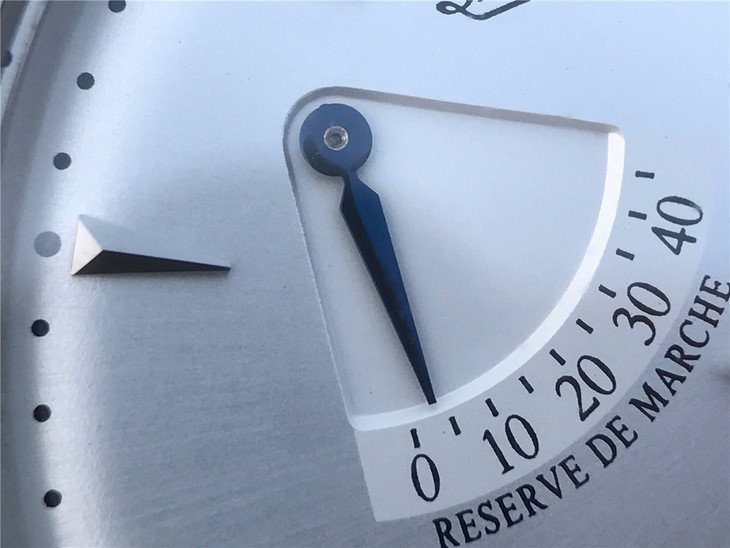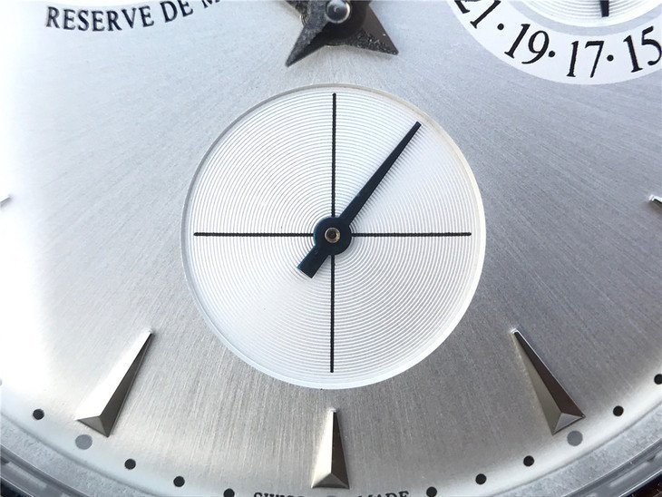 Посеребренный, переливающийся. Полированные часовые риски и вороненные стрелки. Циферблат индикатора запаса хода в отметке на 22.30 часов и циферблат календаря в отметке на 14.00 часов. Малая секундная стрелка в отметке на 18.00 часов. |