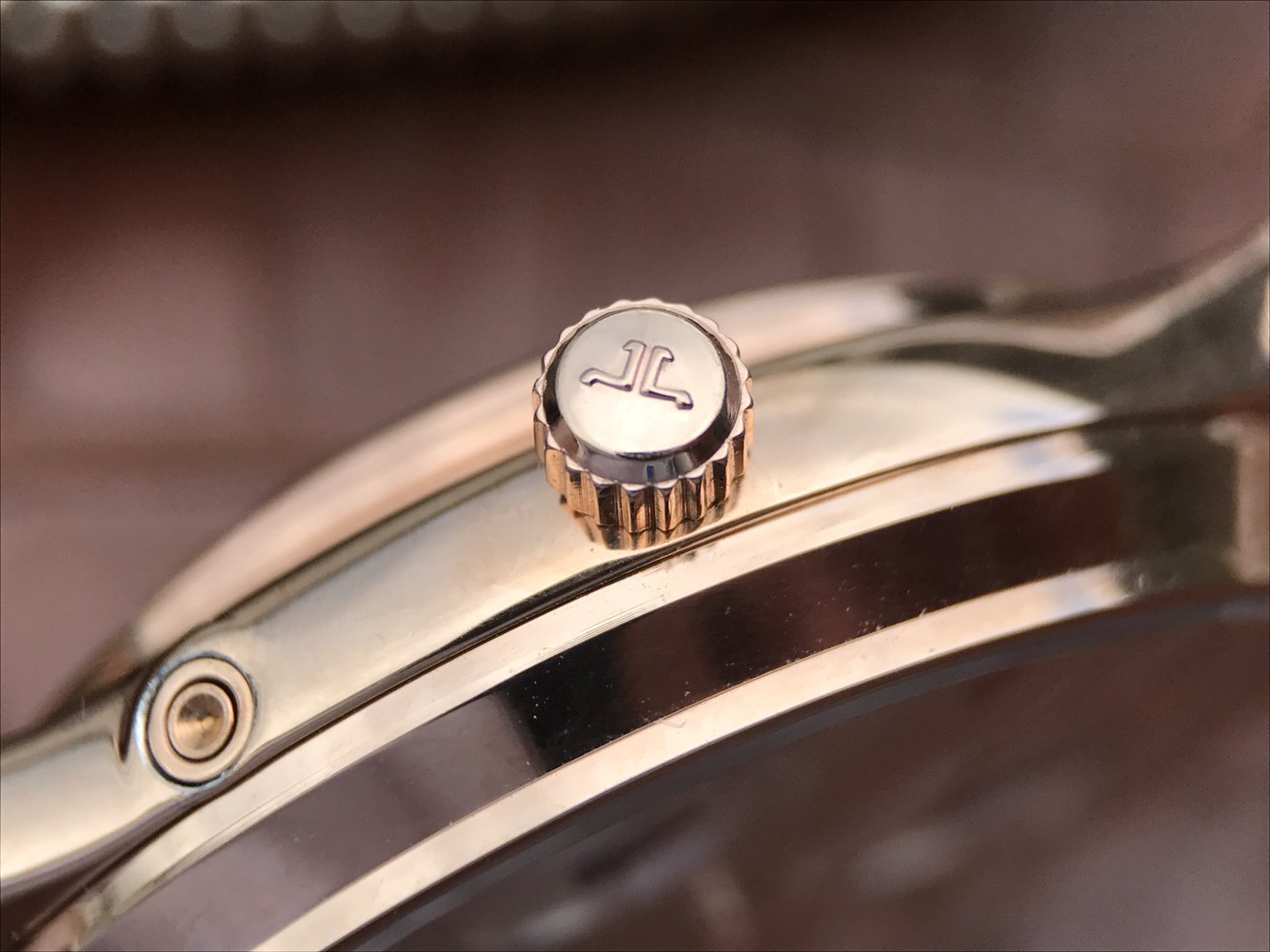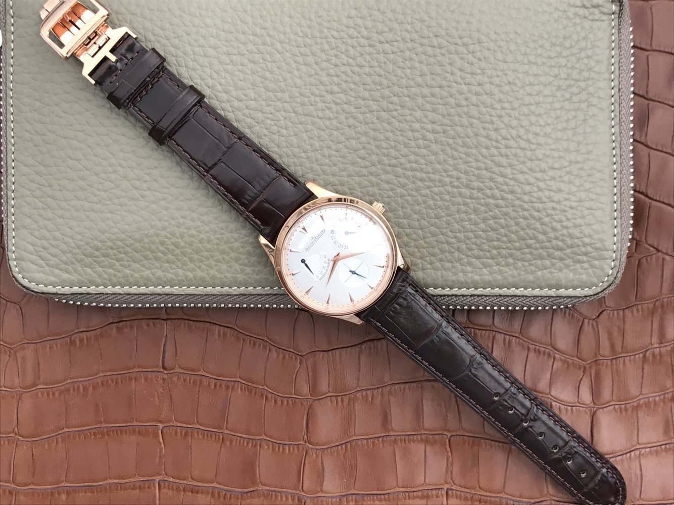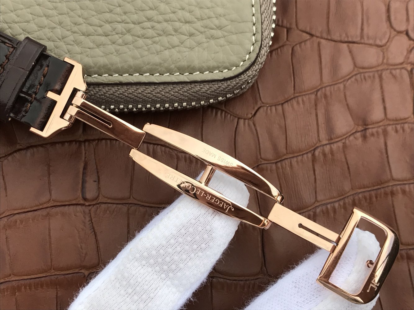 Коричневый кожаный ремешок, с двойной раскладывающейся позолоченной застежкой Jaeger-LeCoultre. |