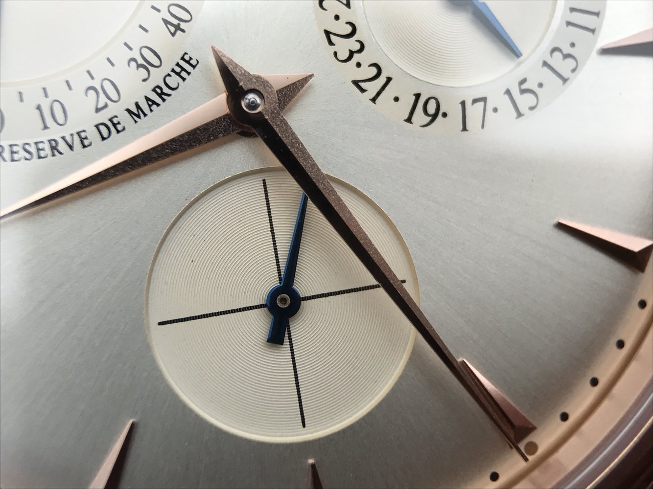 Посеребренный, переливающийся. Позолоченные часовые риски и стрелки. Циферблат индикатора запаса хода в отметке на 22.30 часов и циферблат календаря в отметке на 14.00 часов. Малая секундная стрелка в отметке на 18.00 часов. |