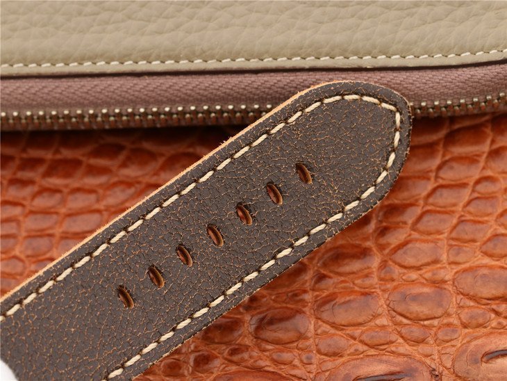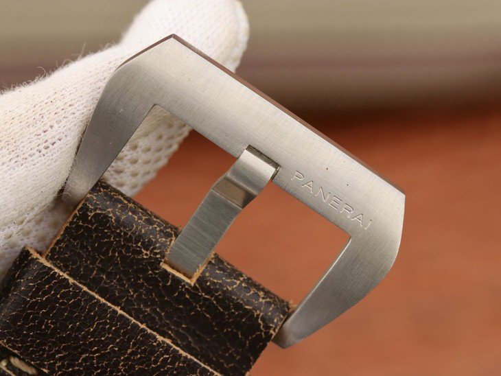 Коричневый кожаный ремешок, из толстой телячьей кожи, с простым (с помощью шипа) V-образным титановым замком Panerai. |