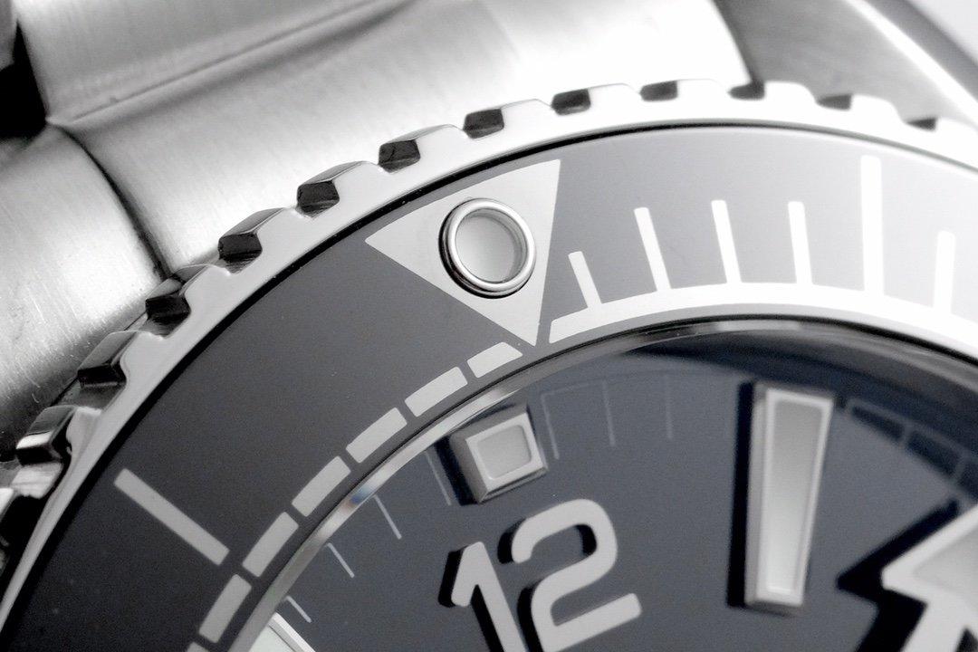 Черная керамика. Полированные часовые риски и 3D стрелки, покрытые люминесцентным составом Super LumiNova С1 + С3, зеленого и голубого свечения. Окно даты, расположенное в отметке на 15.00 часов |