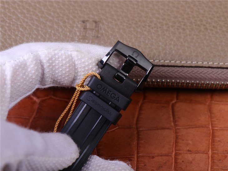 Чёрный каучуковый ремешок нового образца, с простым (с помощью шипа) керамическим замком Omega. |