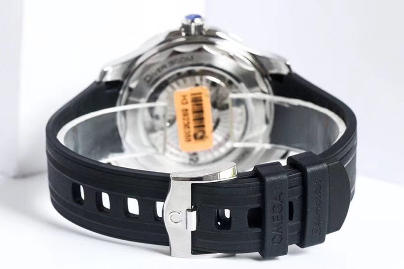 Чёрный каучуковый ремешок нового образца, с простым (с помощью шипа) керамическим замком Omega. |