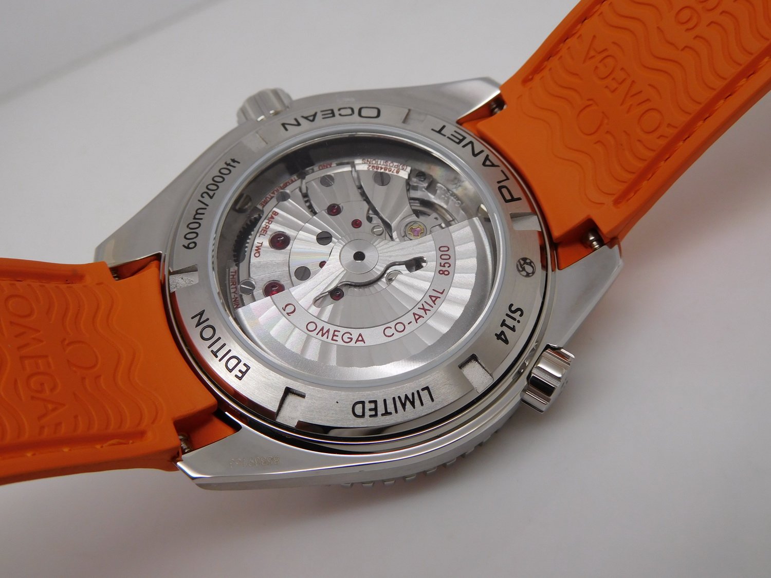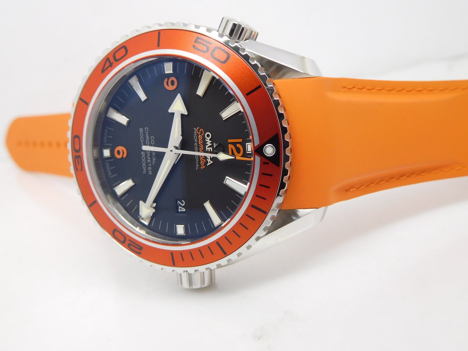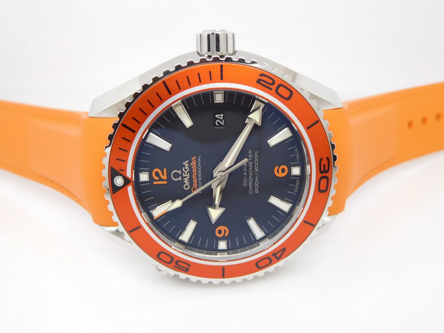 Оранжевый каучуковый ремешок, с двойной раскладывающейся застежкой Seamaster Planet Ocean. Либо стальной браслет. |