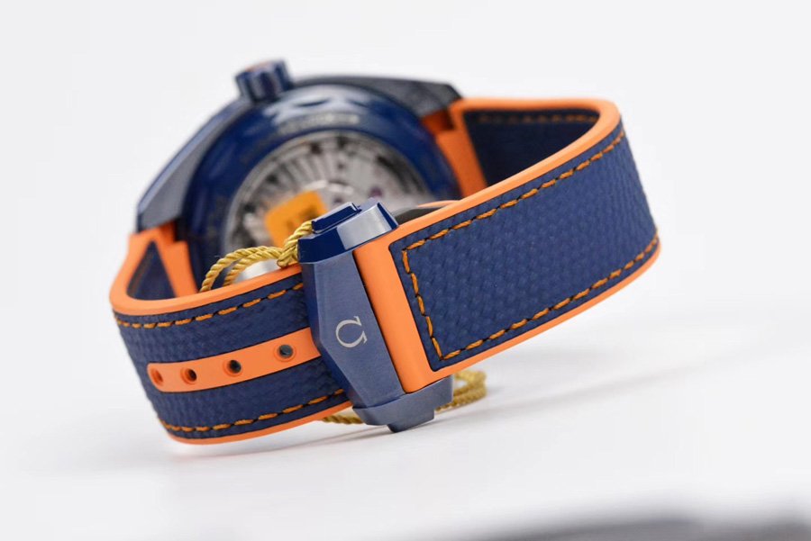 Синий комбинированный (ткань/каучук) ремешок, с двойной раскладывающейся керамической застежкой Omega. |