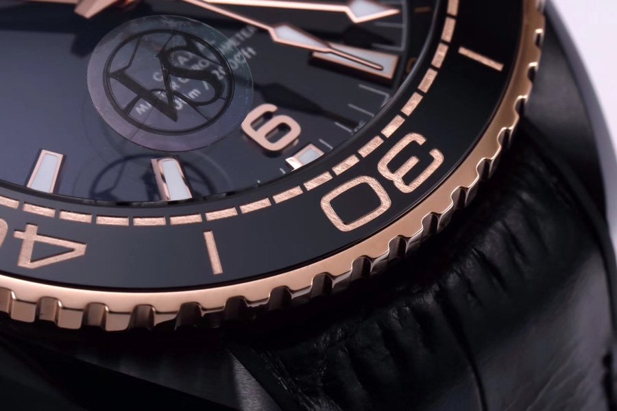 Черный, глянцевый (керамика). Позолоченные часовые риски и 3D стрелки, покрытые люминесцентным составом Super LumiNova С1 + С3, зеленого и голубого свечения. Окно даты, расположенное в отметке на 15.00 часов. |