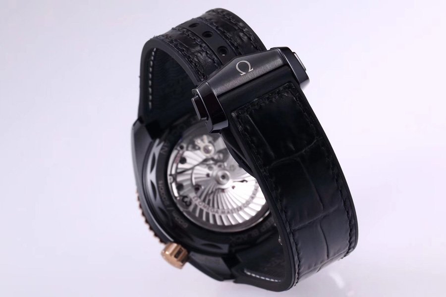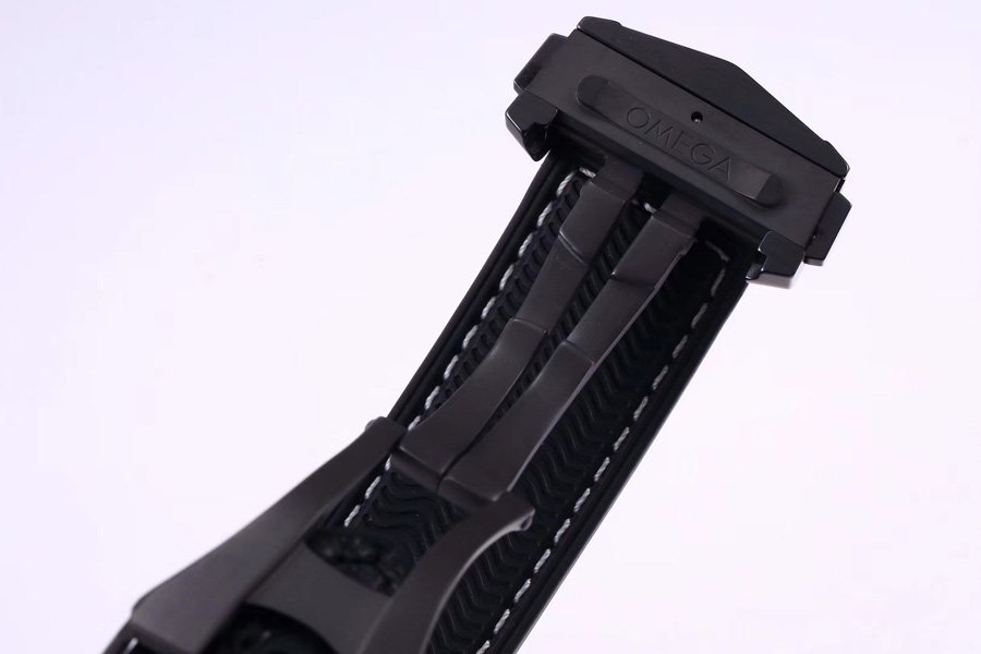 Черный комбинированный (кожа/каучук) ремешок, с двойной раскладывающейся керамической застежкой Omega. |