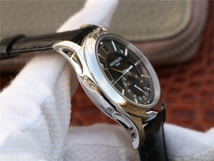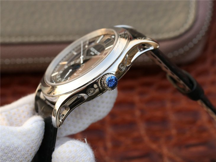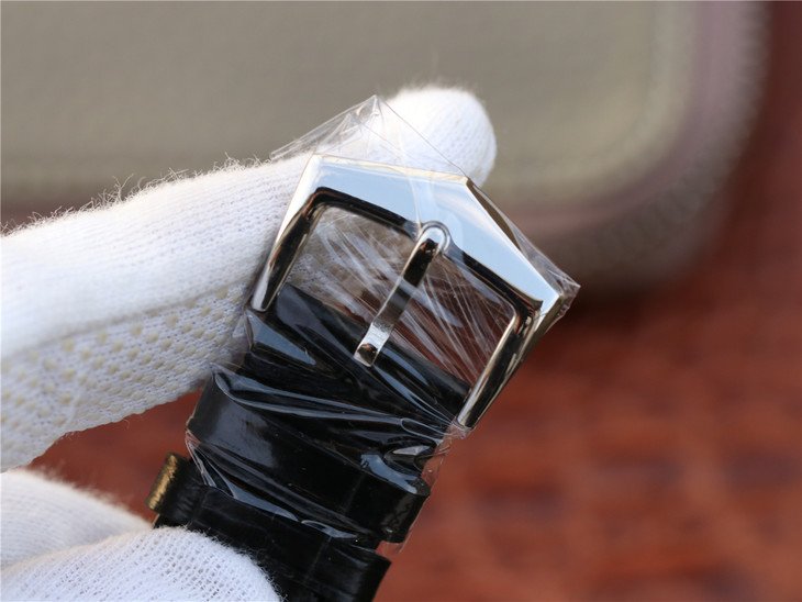 Черный кожаный ремешок с простым (с помощью шипа) стальным полированным замком Patek Philippe. Система быстрой смены ремешка. |
