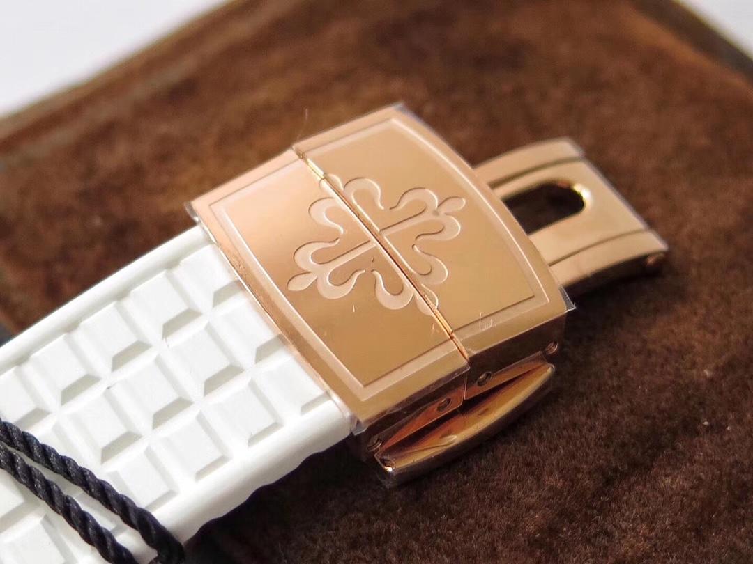 Белый каучуковый ремешок "Patek Philippe Tropical", с двойной раскладывающейся застежкой Aquanaut. Либо стальной браслет из сатинированной/полированной стали, с двойной раскладывающейся застежкой Aquanaut. |