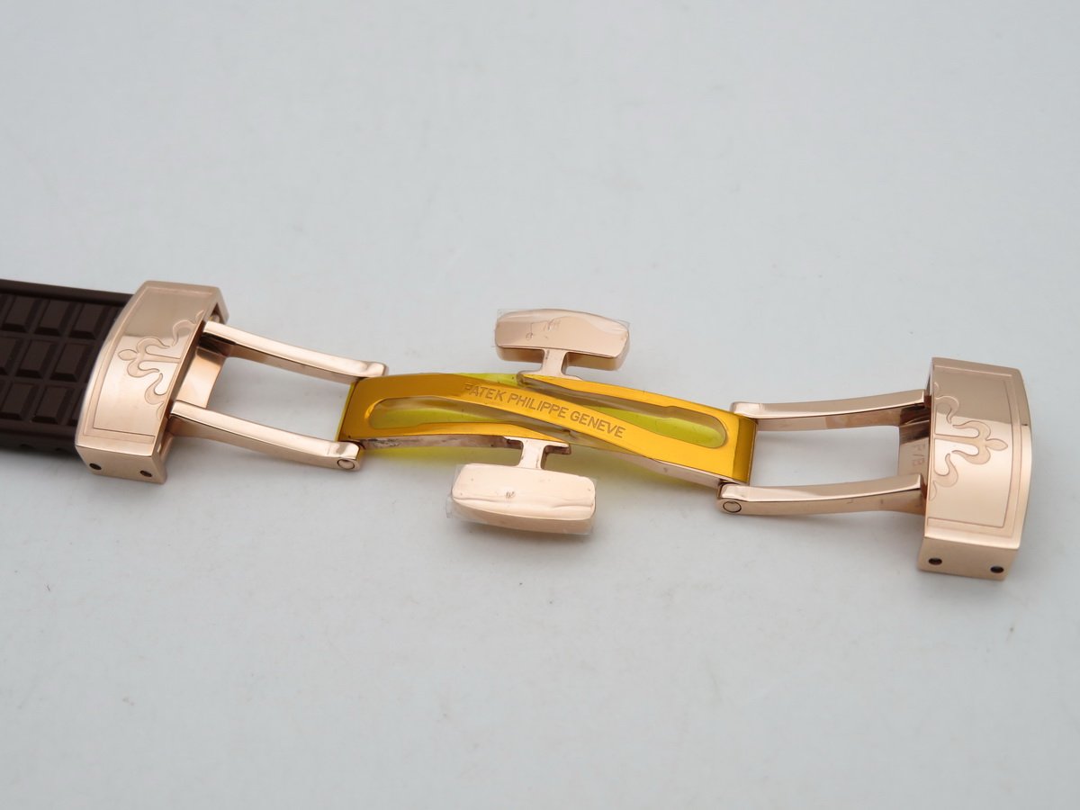 Коричневый каучуковый ремешок "Patek Philippe Tropical", с двойной раскладывающейся застежкой Aquanaut. Либо стальной браслет из сатинированной/полированной стали, с двойной раскладывающейся застежкой Aquanaut.