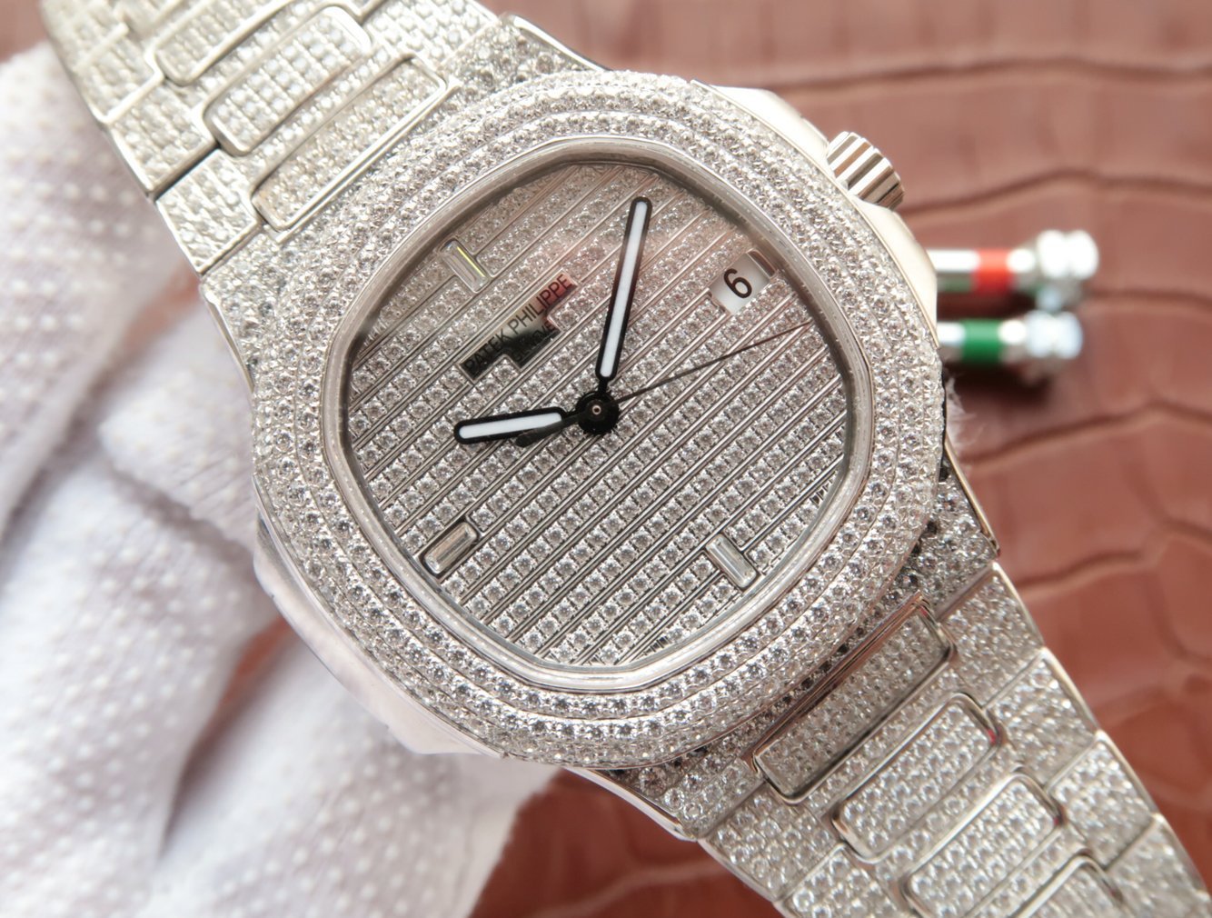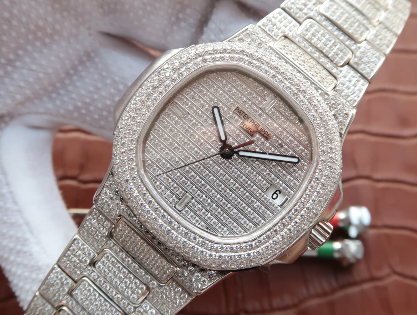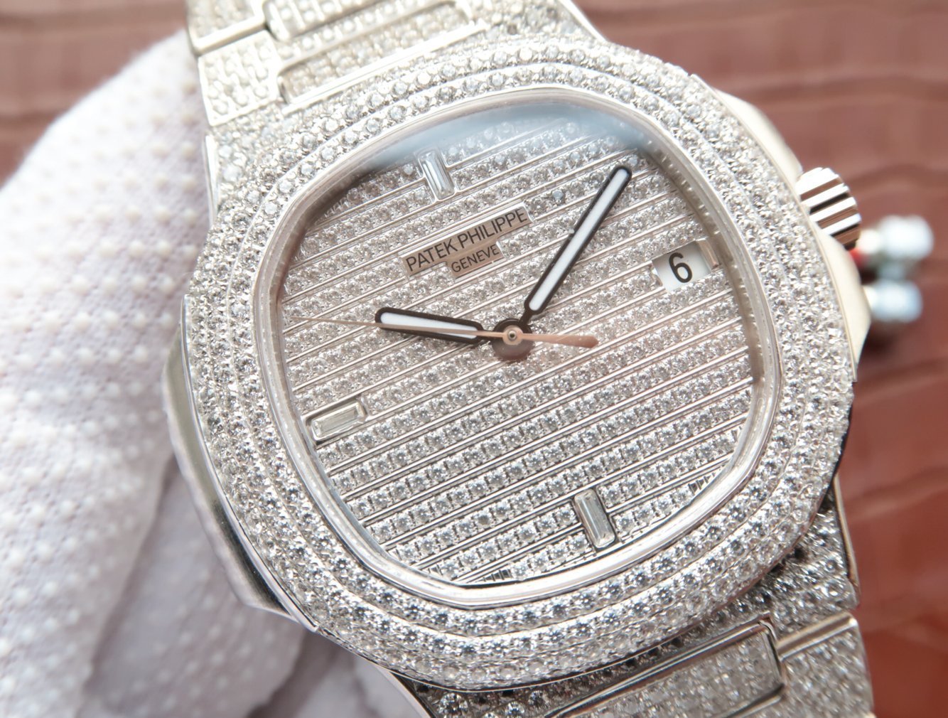 Инкрустированный алмазами. Окно даты, расположенное в отметке на 15.00 часов |