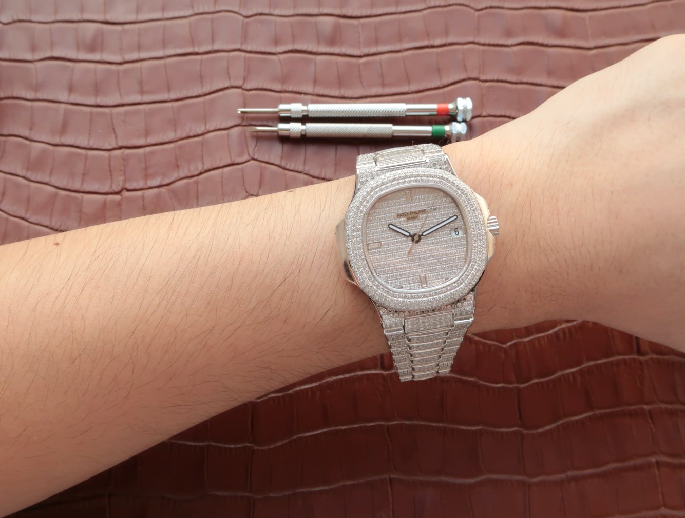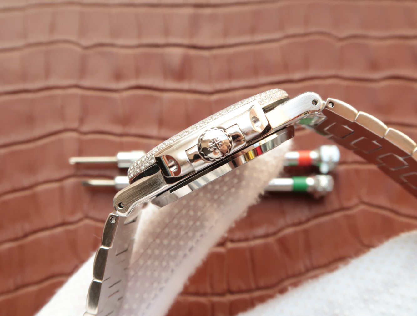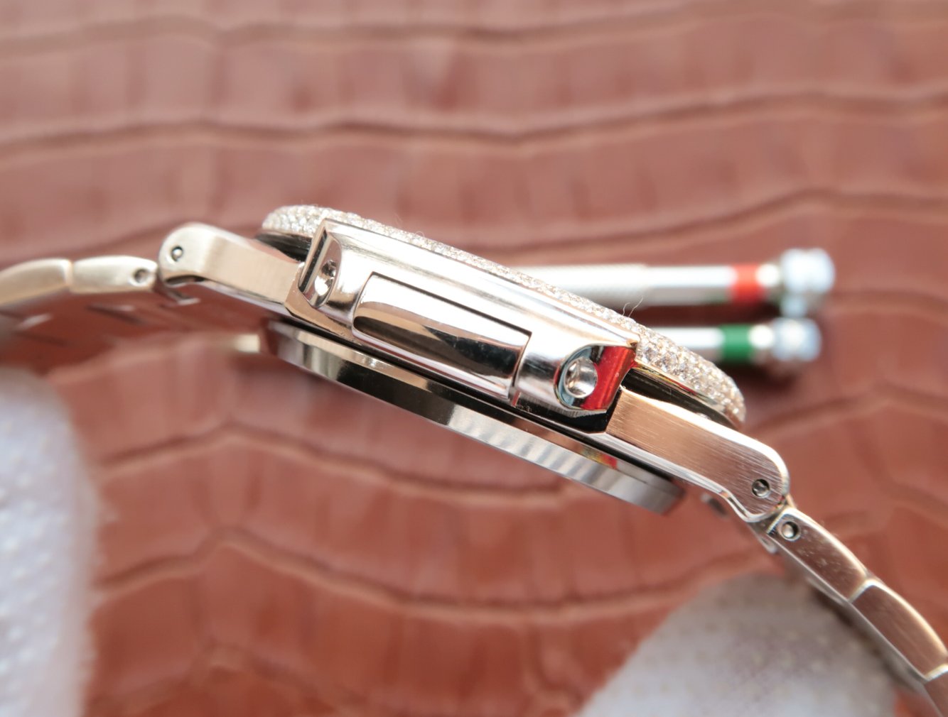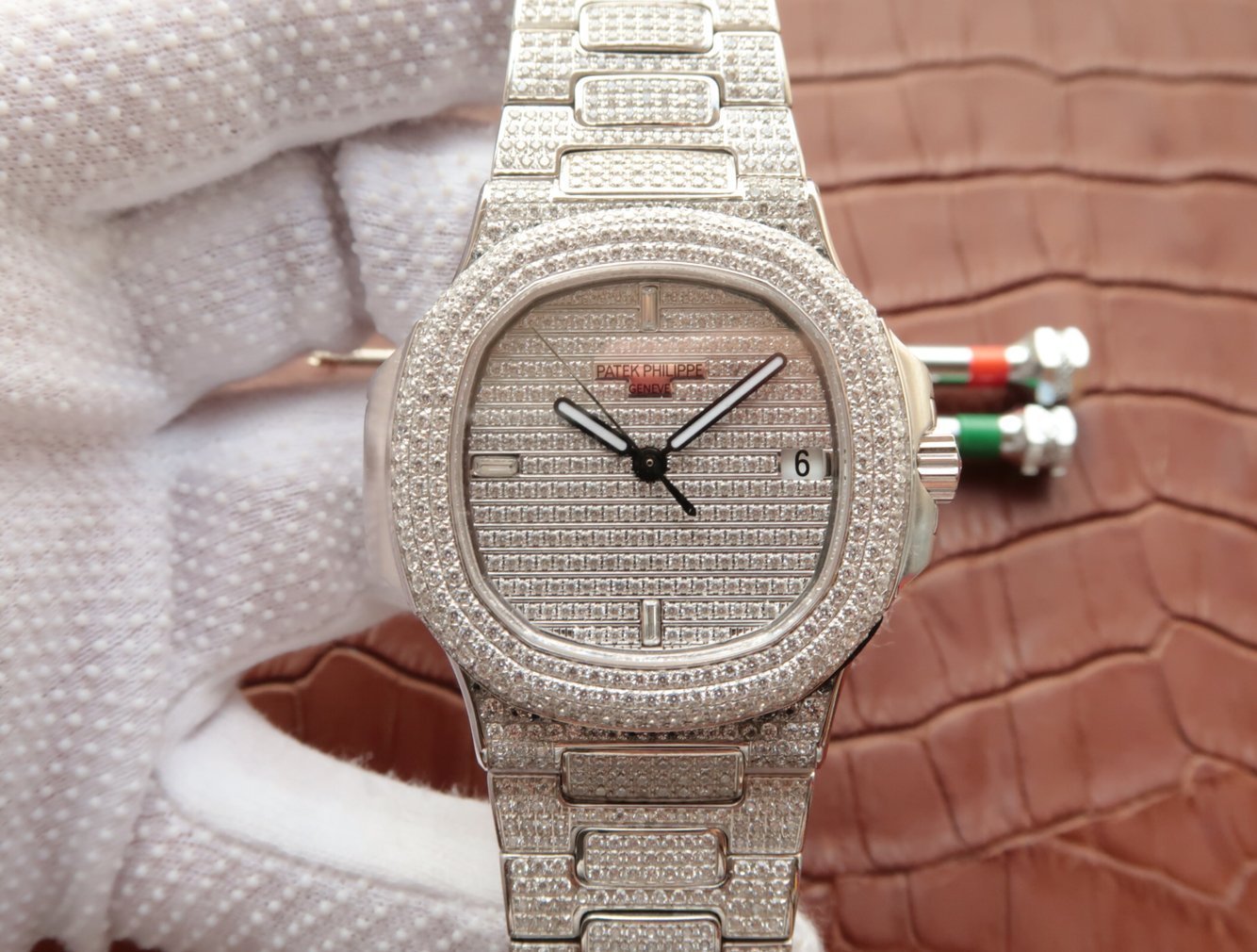 Инкрустированный алмазами. Окно даты, расположенное в отметке на 15.00 часов |