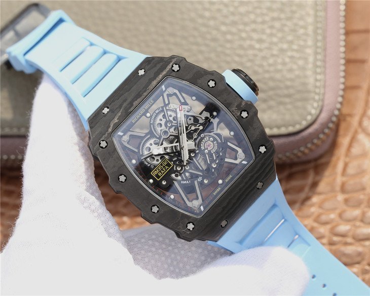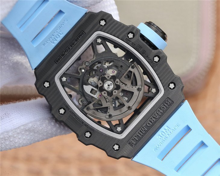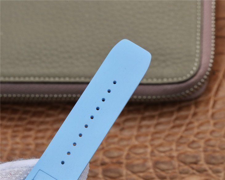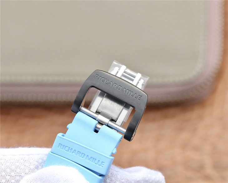 Голубой каучуковый ремешок, с двойной раскладывающейся титановой застежкой Richard Mille. |