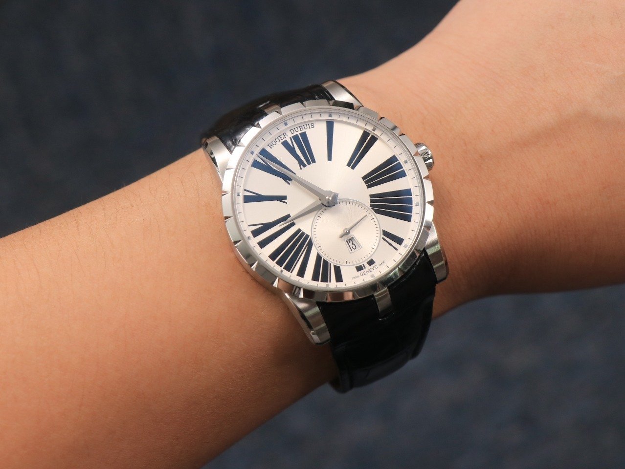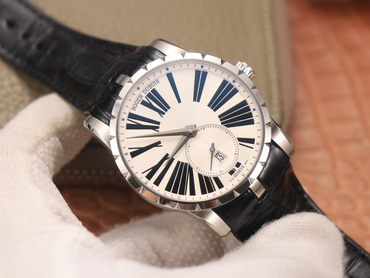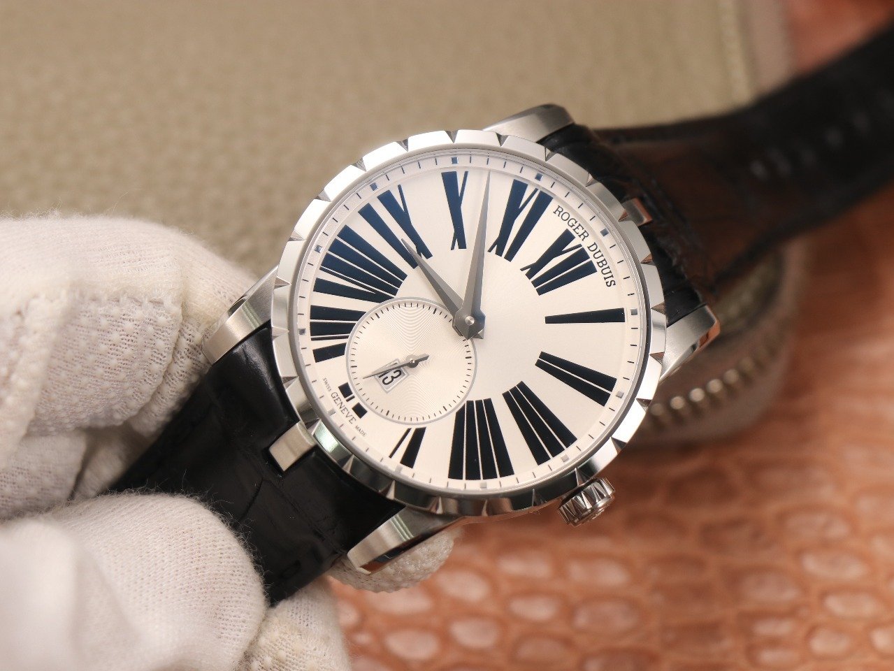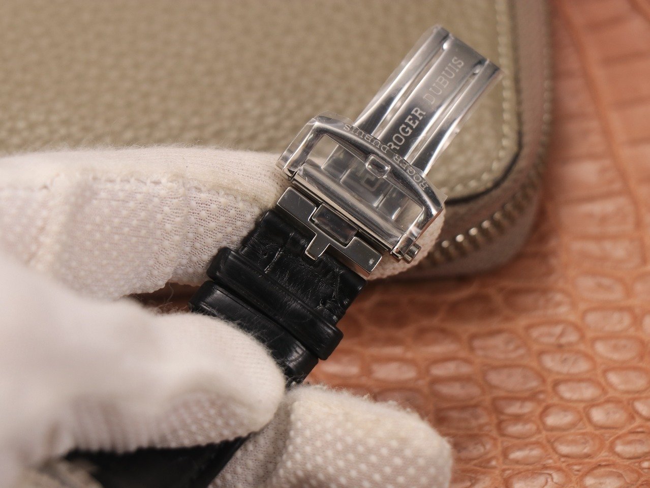Черный кожаный ремешок, с двойной раскладывающейся стальной застежкой Roger Dubuis. |
