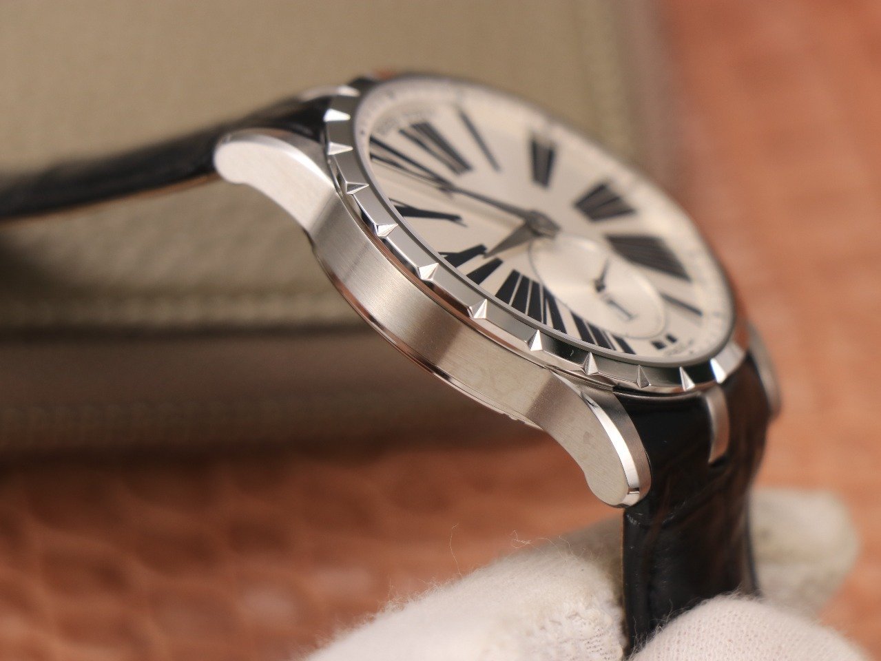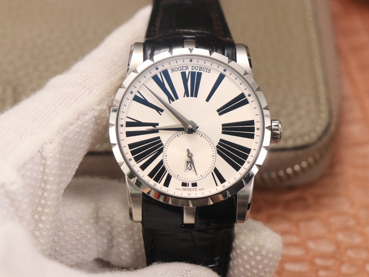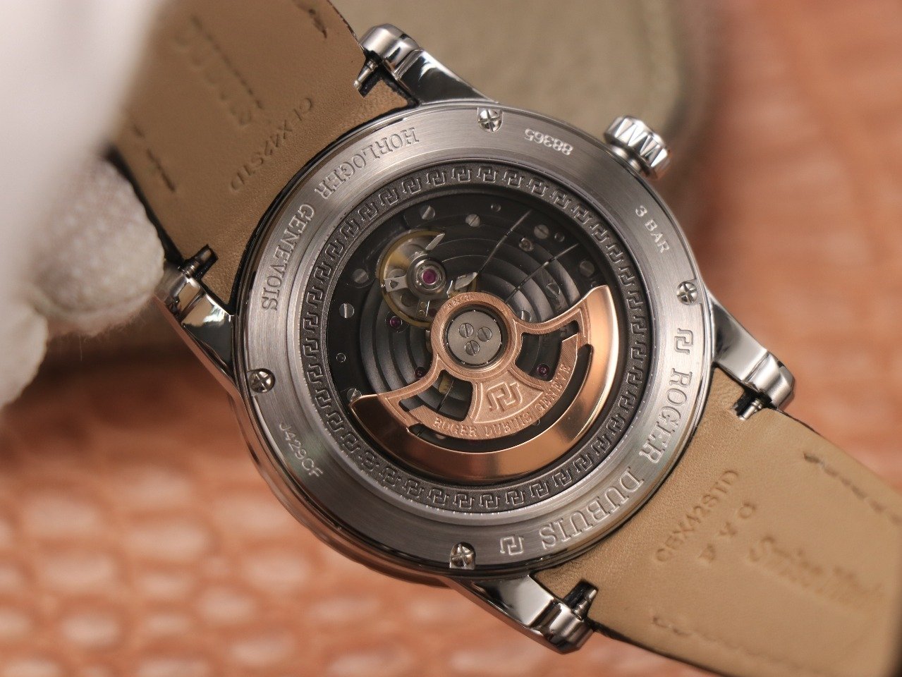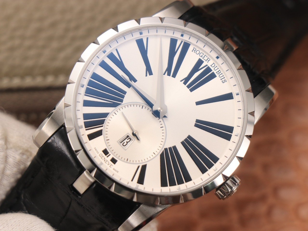 Черный кожаный ремешок, с двойной раскладывающейся стальной застежкой Roger Dubuis. |