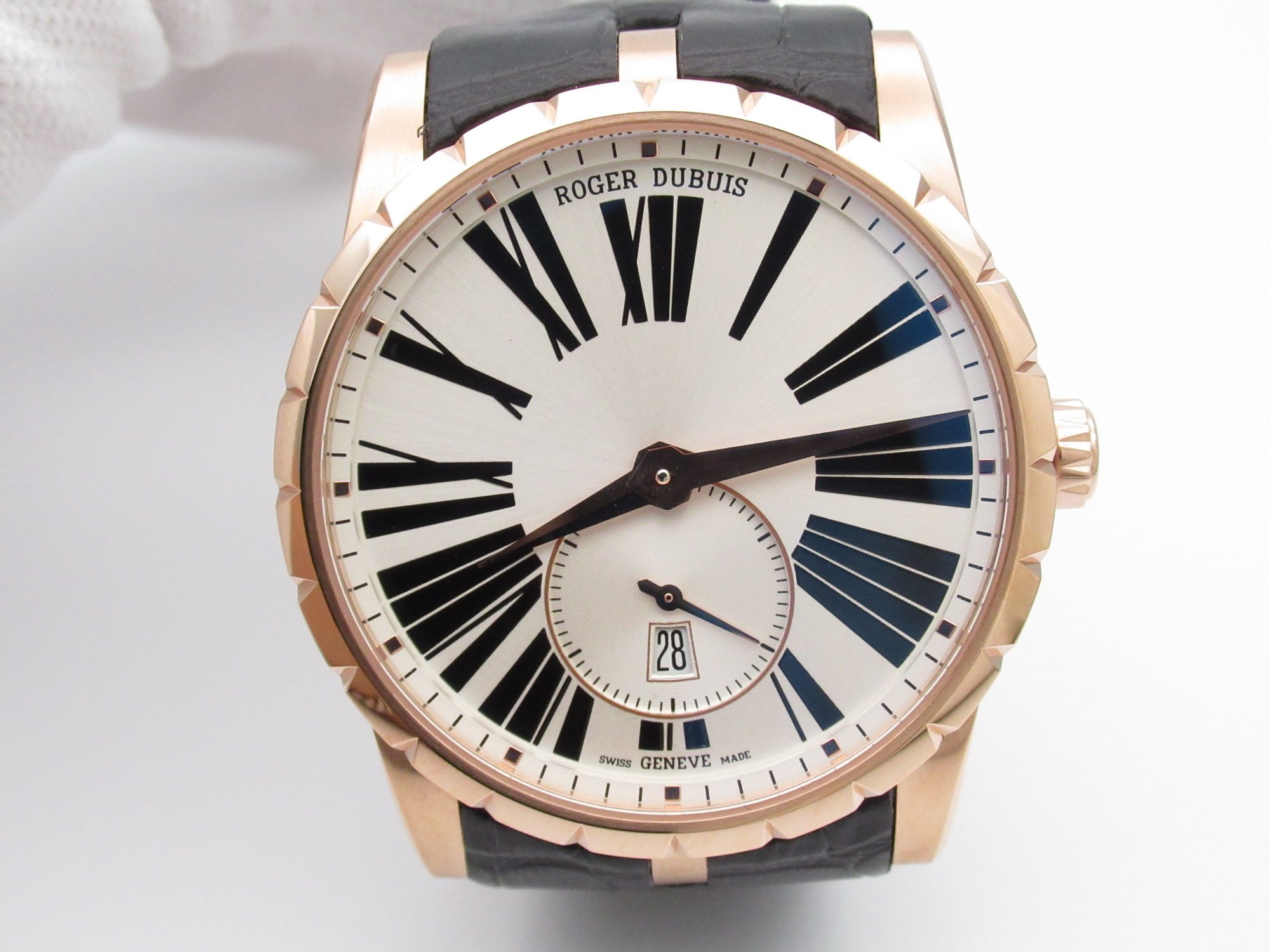 Чёрный кожаный ремешок, с двойной раскладывающейся позолоченной застежкой Roger Dubuis. |