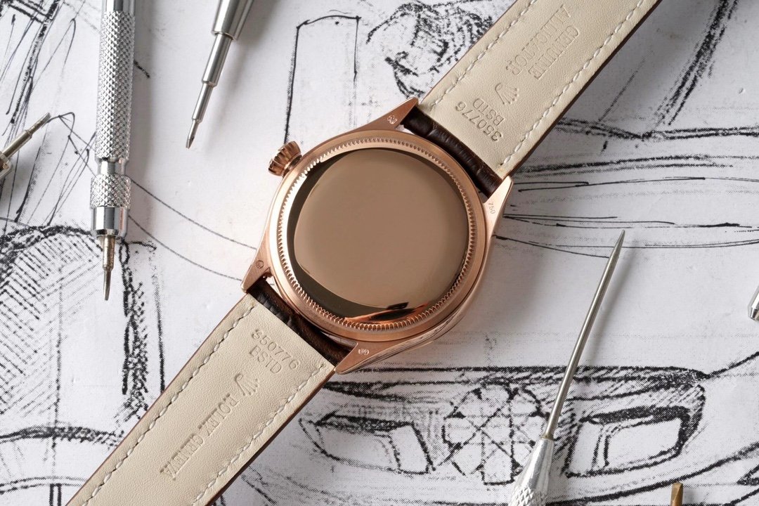 Белый. Полированные часовые риски по радиусу циферблата и классические мечевидные стрелки. Разграниченная минутная шкала на нижнем уровне циферблата. Гравировка маркировки Rolex и серийного номера Rolex на внутреннем |
