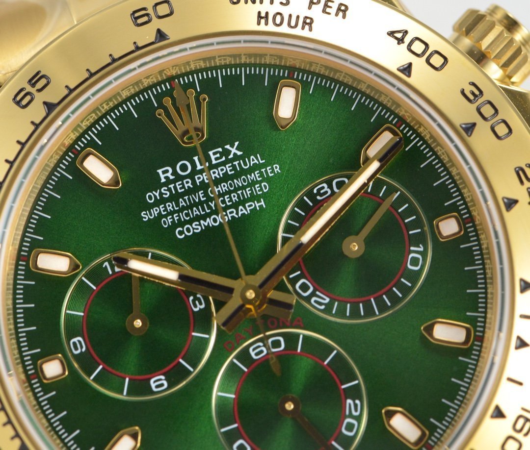 Зеленый, переливающийся («солнечные лучи»). Позолоченные часовые риски и стрелки, покрытые белым люминесцентным составом Super Lumonova C3. Малые циферблаты хронографа и циферблат малой секундной стрелки, расположенный в отметке на 18.00 часов. |