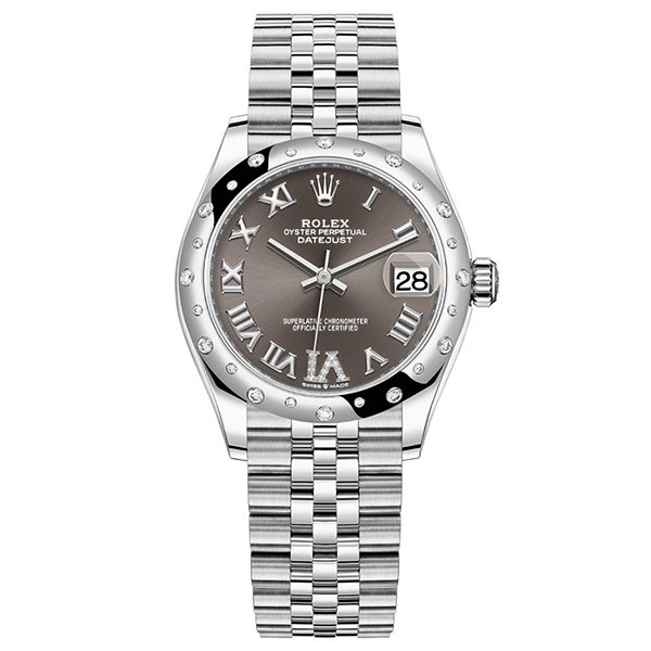 Фиксированный в одном положении,полированный безель украшен камнями; Гравировка маркировки Rolex (3 короны Rolex) с внутренней стороны безеля.