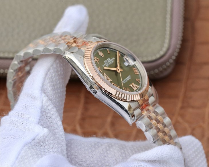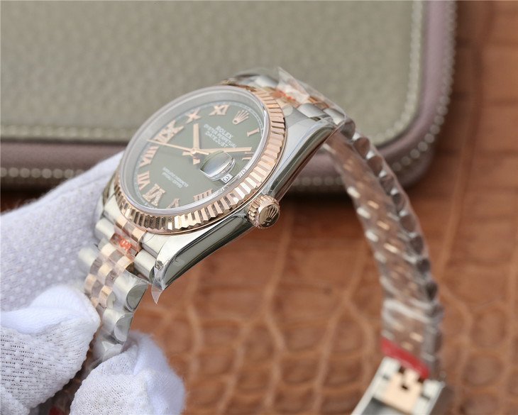 Фиксированный в одном положении, позолоченный полированный рифленный безель; Гравировка маркировки Rolex (3 короны Rolex) с внутренней стороны безеля. |