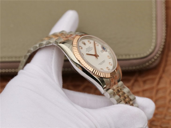 Перламутровый, переливающийся (Mother of Pearl). Позолоченные часовые риски, инкрустированные белыми сапфирами. Окно даты, расположенное в отметке на 15.00 часов, под увеличительным окном 2.5.