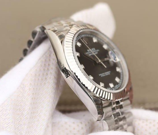 Графитовый (Rhodium), переливающийся. Часовые риски, инкрустированные белыми сапфирами (МОР). Окно даты в отметке на 15.00 часов под увеличительным окном 2,5. Гравировка маркировки Rolex и серийного номера Rolex на внутреннем ранте. |