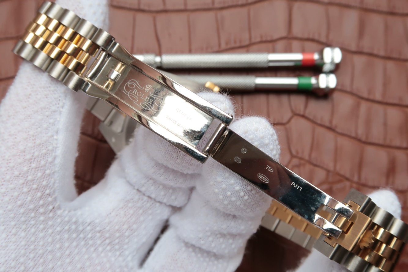 Стальной комбинированный (сталь/золото) браслет Rolex Jubilee, с двойной раскладывающейся застежкой Crownclasp. Либо стальной браслет Rolex Oyster. Серийный номер и маркировка Rolex на конечных звеньях браслета |