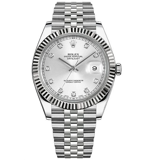 Серебристый, переливающийся. Стальные часовые риски, инкрустированные белыми сапфирами и полированные стальные стрелки, покрытые люминесцентным составом Super LumiNova С3. Окно даты в отметке на 15.00 под увеличительным окном 2,5. Гравировка маркировки Rolex и серийного номера Rolex на внутреннем ранте. |