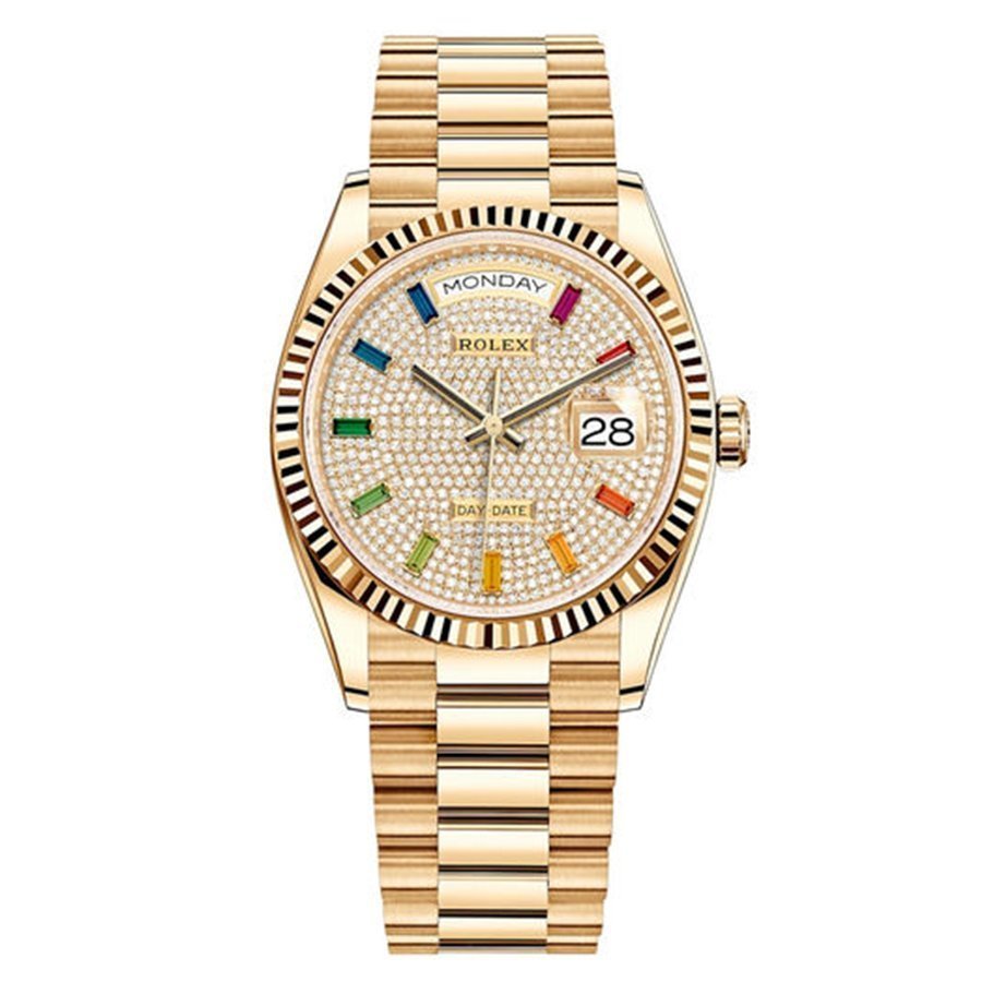 Характеристики Rolex Day-Date Ladies Diamond-paved 10 baguette rainbow sapphires 128238