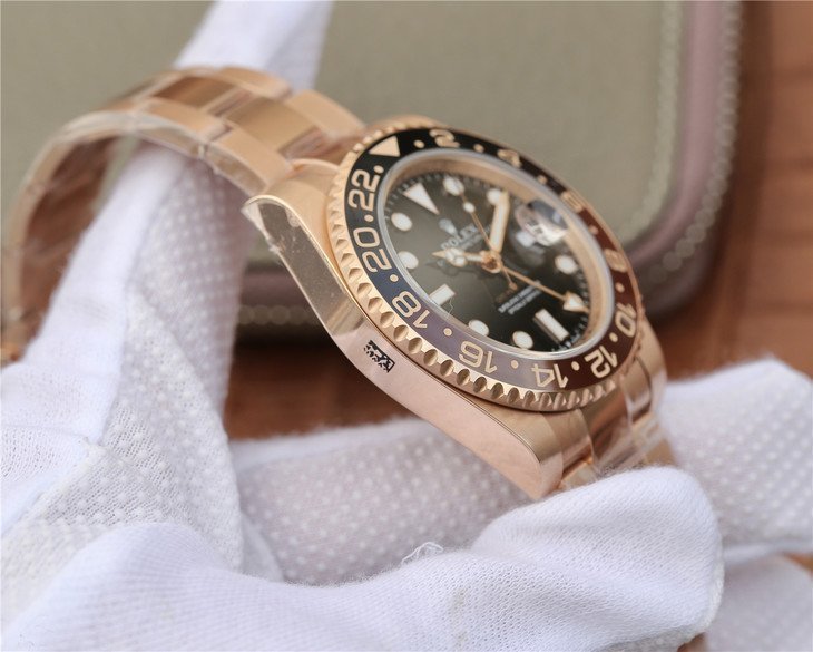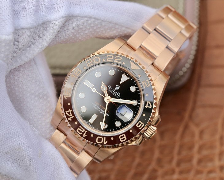 Двунаправленный, вращающийся коричнево-чёрный керамический безель, с часовыми метками времени GMT (при вращении безеля 24 щелчка). |