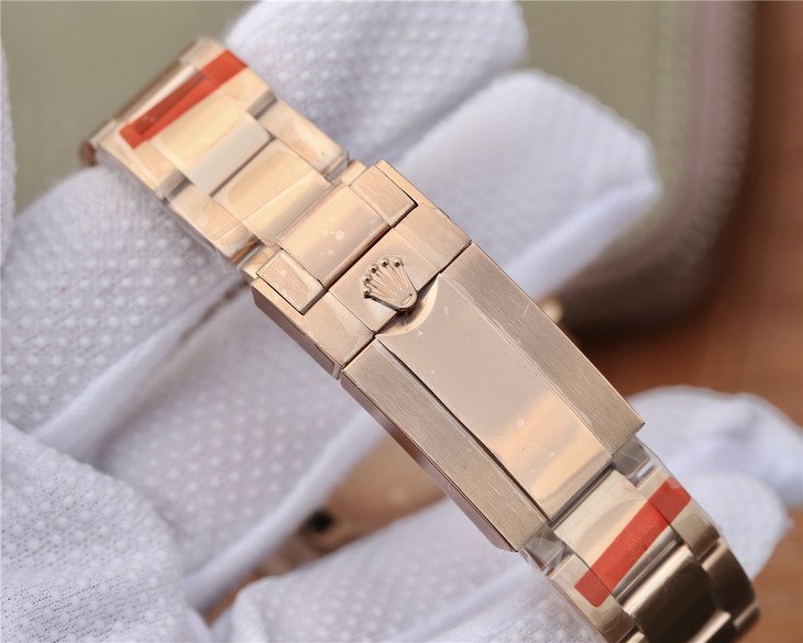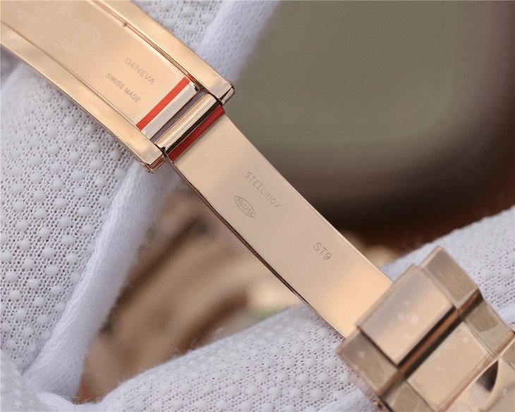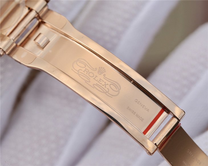 Обёрнутый в натуральное розовое золото браслет Rolex Oyster, с двойной раскладывающейся застёжкой Oysterlock. Серийный номер и маркировка Rolex на конечных звеньях браслета. |