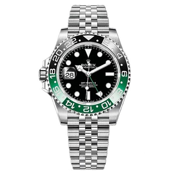 Двунаправленный, вращающийся черно-зеленый керамический безель, с часовыми метками времени GMT (при вращении безеля 24 щелчка). |