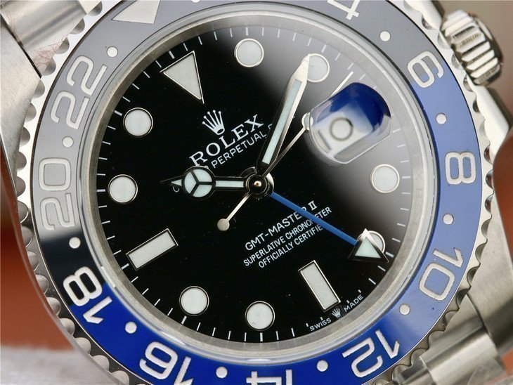 Двунаправленный, вращающийся сине-черный керамический безель, с часовыми метками времени GMT (при вращении безеля 24 щелчка). |