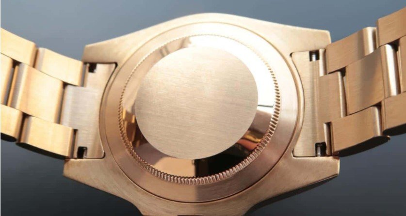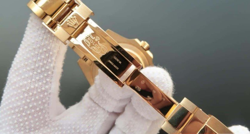 Золотой браслет Rolex Oyster, с двойной раскладывающейся застёжкой Oysterlock и удлиняющим звеном Glidelock для одевания поверх гидрокостюма. Серийный номер и маркировка Rolex на конечных звеньях браслета. |