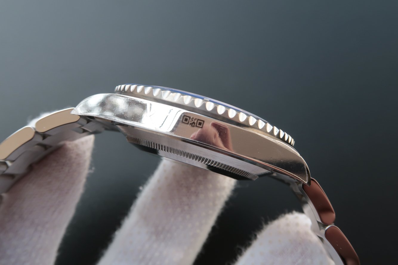 Однонаправленный, вращающийся синий керамический безель, с минутными метками и направляющей люминесцентной меткой в отметке на 12.00 часов (при вращении безеля 120 щелчков). |
